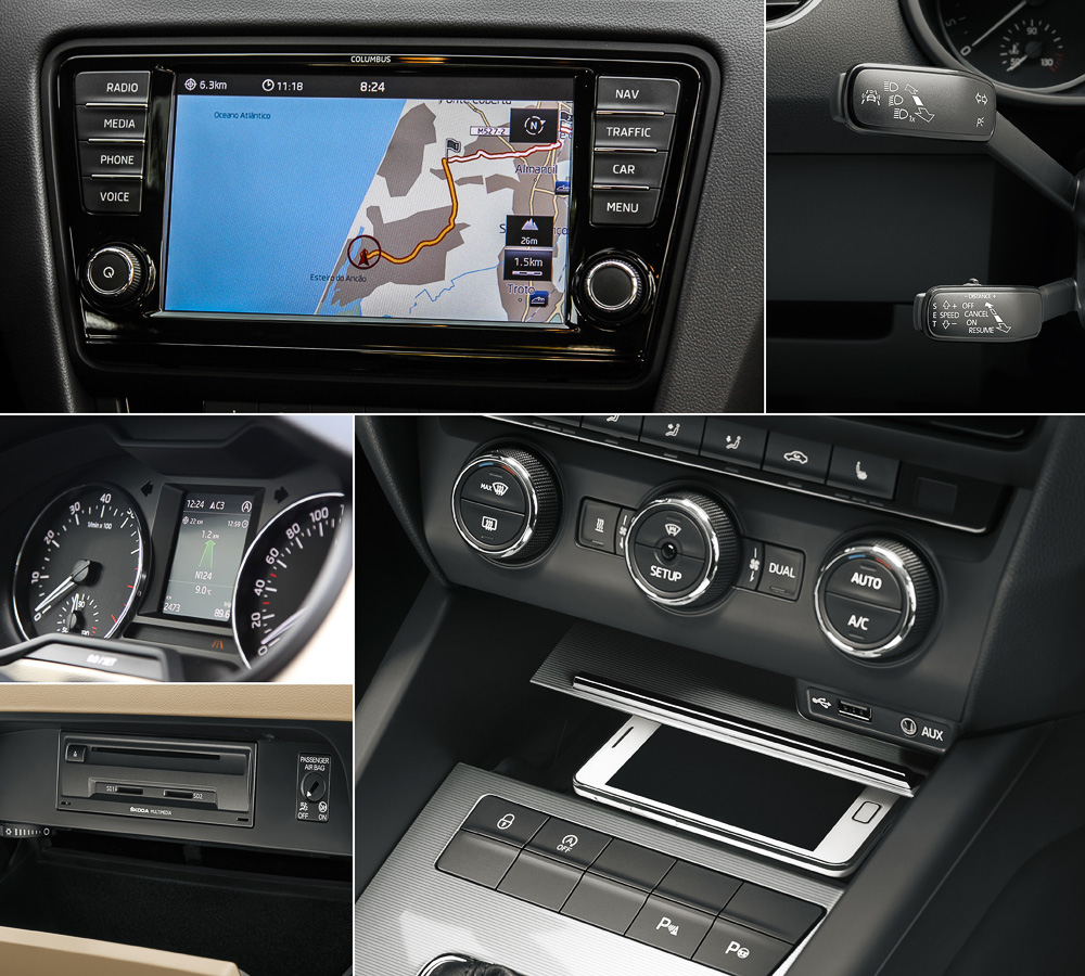 Але чехи знають, що розмір далеко не завжди найважливіший в житті. Саме тому вони велику увагу приділили якості збірки салону і всіляким «наворотам». Матеріали обробки приємні, шумоізоляція дуже гідна, про продуману ергономіку можна взагалі мовчати. А якщо ми говоримо про машини в багатих комплектаціях, то взагалі дивуєшся новій «Октавії». Наприклад, тут може бути встановлений красивий 8-дюймовий сенсорний екран або пристрій для читання DVD. Плюс до цього Octavia оснащується «фішкою» для мобільного телефону, яка отримала назву Phone Box. Її суть в наступному – в ніші під магнітолою і кліматичною системою встановлена спеціальна антена, яка забезпечує так зване індуктивне підключення до зовнішньої антени. Якщо опустити всі розумні технічні подробиці про те, як слова по повітрю летять від одного телефону до іншого, то ми отримуємо, що в машині з Phone Box прийом «мобіли» стає кращим, і ви продовжуєте говорити, коли водії в сусідніх авто вже істерично кричать «Альо, альо, дуже погано чути».