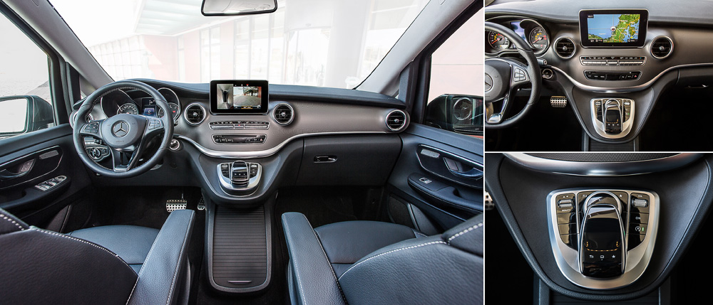 Салон Mercedes-Benz V- класу радує формами і функціональністю. Але ось “сенсорний килимок” вимагає звикання. Мультимедійній системі бракує інтуїтивності – щоб розібратися, як поміняти пункт призначення із вже присутніх в списку, знадобиться час. Сама навігація перекладена російською мовою, але звучить місцями трохи дивно. “Потрібно буде повернути наліво”, – говорить мені жіночий голос. Потрібно буде? Повернемо! Адже до точності роботи системи претензій немає.